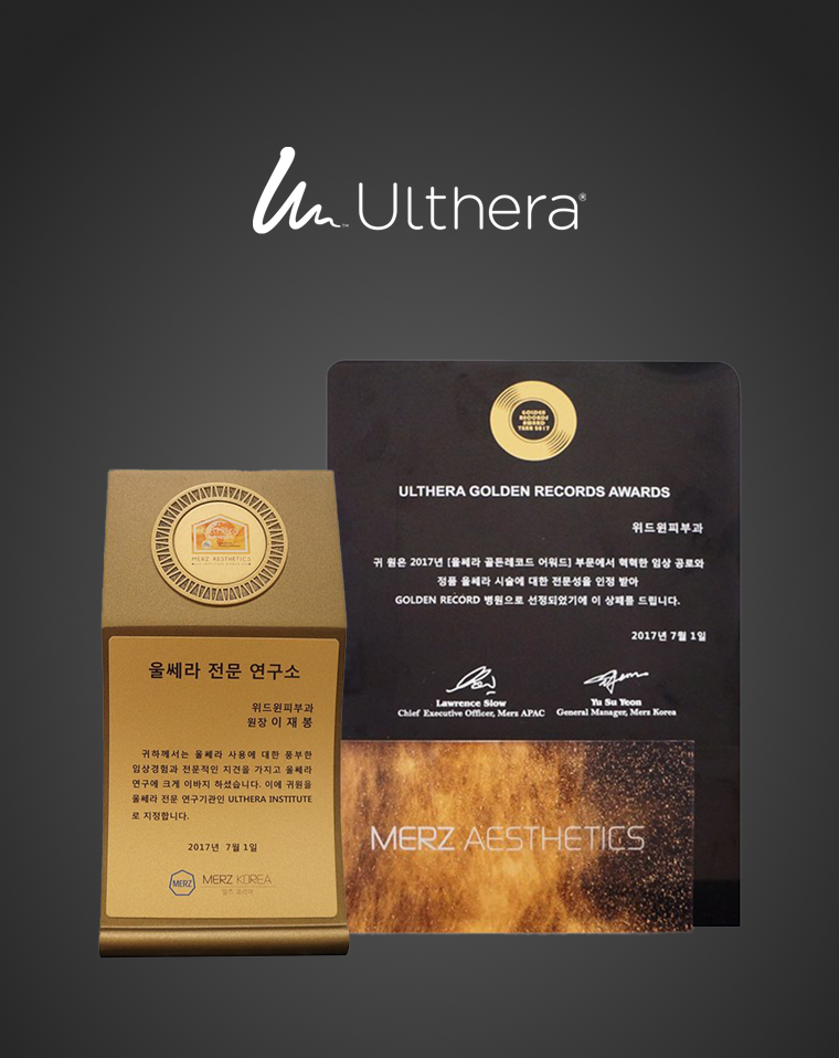 Merz Aesthetics에서 진행된 울쎄라 시술 연구 분야에서 성과를 인정받아 수상하였으며, 압구정 위드윈피부과는 울쎄라 전문 연구기관으로서의 학술적 기반을 갖춘 진료 환경을 이어가고 있습니다.