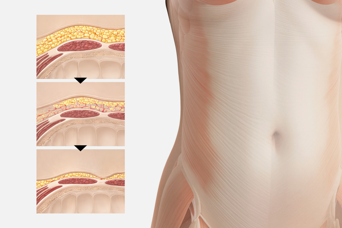 복부는 표층 지방, 심층 지방, 그리고 그 사이의 표층 근막계로 이루어져 있습니다. 이러한 지방층 구조를 고려해 시술 계획을 세우는 것이 중요합니다.