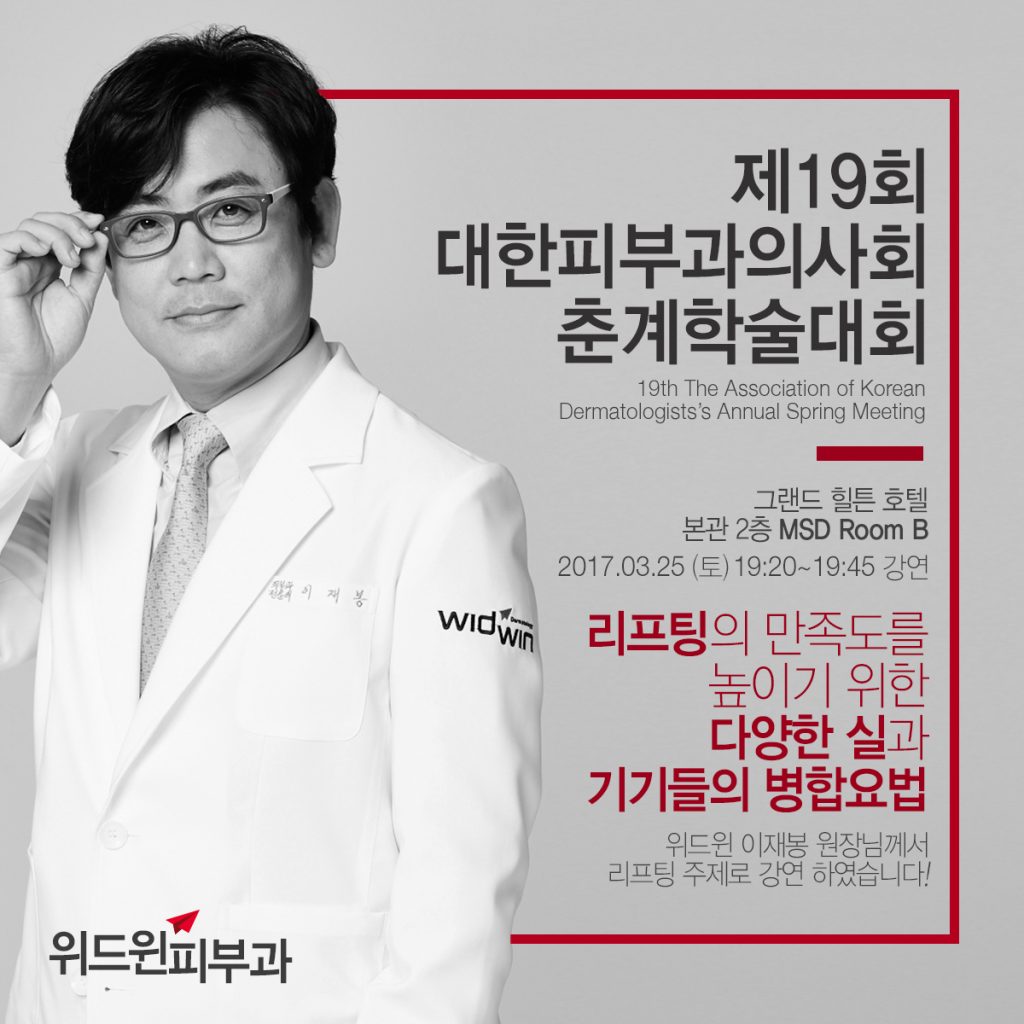 공지사항3월 24, 20263월 24, 2026 2017 제19회 대한피부과의사회 춘계학술대회 피부과전문의 이재봉원장님께서‘리프팅의 만족도를 높이기 위한 다양한 시로가 기기들의 병합 요법’주제로 강연 하셨습니다 ^^ 압구정 위드윈피부과에서는실루엣소프트, 엔코그, 엔코그멀티, 엔코그로얄,엔스카폴드 등의 다양한 실을 사용하여실리프팅의 효과를 선보여드리고 있는데요! 실리프팅의 더 다양한 소식과위드윈피부과 이재봉원장님의 강연 소식은 아래 링크를 통해 자세하게 확인하실 수 있습니다. http://blog.naver.com/widwinclinic/220968109183 Share